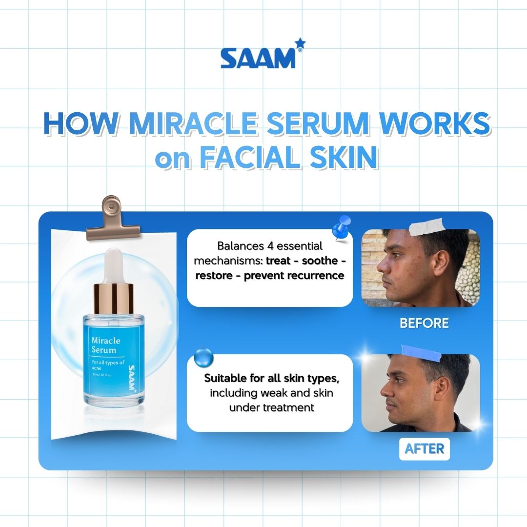 Guided by philosophy “Love Your Perfect Beauty”, SAAM creates clinically backed skincare that focuses on both treatment and restoration, helping you achieve long-term, sustainable results. SAAM Miracle Serum is one of SAAM’s specialized skincare innovations, formulated to address acne-prone skin through a 4-layer biological mechanism: